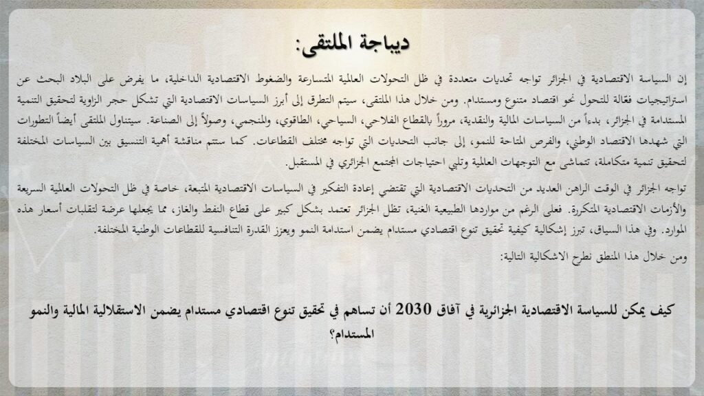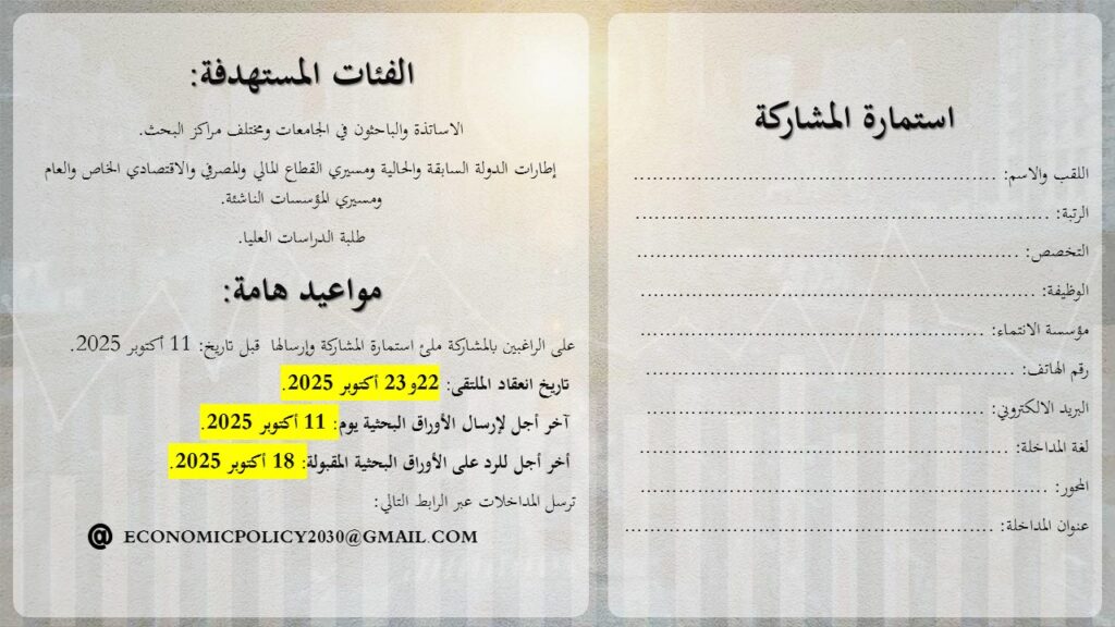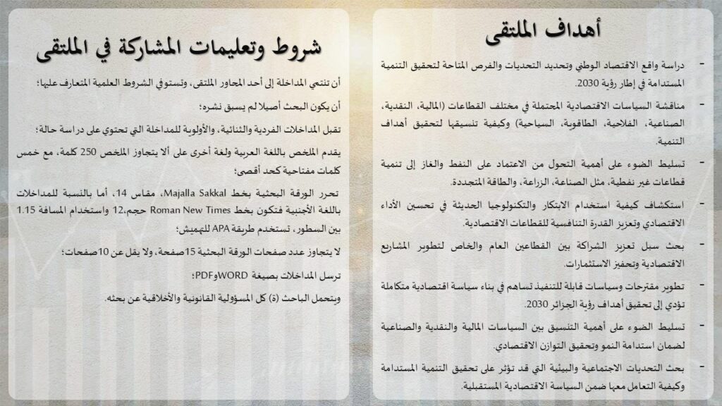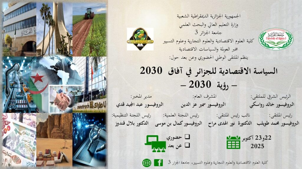 تاريخ انعقاد الملتقى يومي 22 و23 أكتوبر 2025 بكلية العلوم الاقتصادية العلوم التجارية وعلوم التسيير.