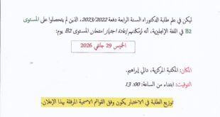 ليكن في علم طلبة الدكتوراه دفعة 2022/2023، الذين لم يتحصلوا على مستوى B2 في اللغة الإنجليزية، أنه با…