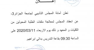 بسم الله الرحمن الرحيم كلمة لا بد منها بعد تنصيبي على رأس جامعة الجزائر 3 أرى بأنه من واجبي أن أتوجه بهذه الرسالة القصيرة إلى جميع أفراد الأسرة الجامعية الكريمة من طلبة، عمال، موظفين وأساتذة. أولا : أطمح أن ألقى الدعم اللازم والمطلوب من طرفكم لأداء مهمتي والمتمثلة أساسا …