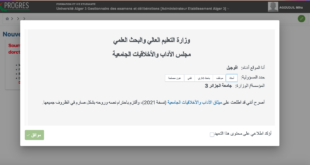 كافة الأسرة الجامعية من أساتذة و موظفين،… مدعوة إلى الإمضاء على ميثاق الآداب والأخلاقيات الجامعية (نسخة 2021) عبر منصة PROGRES عند الولوج الى حساب PROGRES تظهر نافدة مجلس الآداب والأخلاقيات الجامعية مباشرة في الصفحة الرئيسية للامضاء على الميثاق.رابط الولوج لحسابات PROGRES https://progres.mesrs.dz/webfve