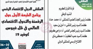 يسر اللجنة العلمية والتنظيمية الملتقى الدولي للاقتصاد الرقمي الطبعة الأولى حول الرقمنة و التحول الاقتصادي العالمي في ظل فيروس كوفيد 19 25-26 اكتوبر 2021 ان تدعوكم للمشاركة باوراق بحثية لمعالجة اشكالية الملتقى ولمزيد من المعلومات حول الملتقى ومحاوره يرجى من سيادتكم زيارة موقع الملتقى على الرابط http://colloquesdz.ga/ او زيارة صفحة …