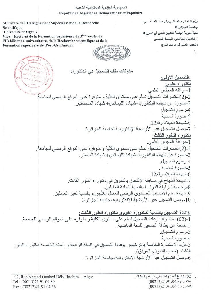 و نحيطكم علما أن التسجيل الورقي سيتم بالتوازي مع التسجيل الإلكتروني عبر الأرضية التي ستكون متوفرة على موقع جامعة الجزائر 3 ابتداء من 17 سبتمبر 2018.