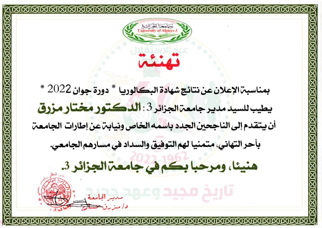 تهنئة السيد مدير الجامعة للناجحين الجدد في شهادة البكالوريا “دورة جوان 2022” 17 يوليو، 2022 أخبار الجامعة, تهنئة, نيابة مديرية الجامعة للعلاقات الخارجية 1,971 زيارة شاركها tweet