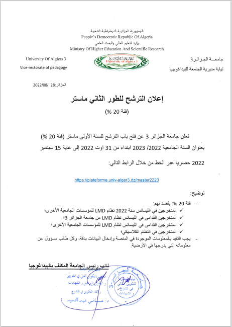 إعلان الترشح للطور الثاني ماستر ( فئة 20% ) 29 أغسطس، 2022 أخبار الجامعة, مستجدات الجامعة 3,172 زيارة شاركها tweet