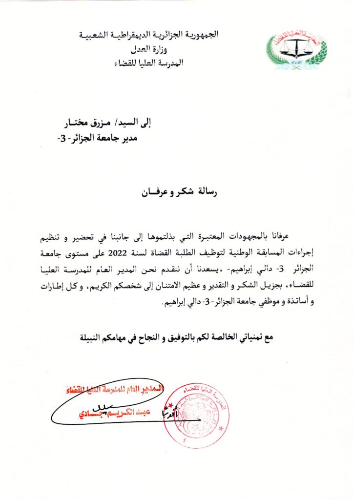 المدرسة العليا للقضاء: رسالة شكر وعرفان 8 نوفمبر، 2022 أخبار الجامعة, نيابة مديرية الجامعة للعلاقات الخارجية 1,770 زيارة شاركها tweet