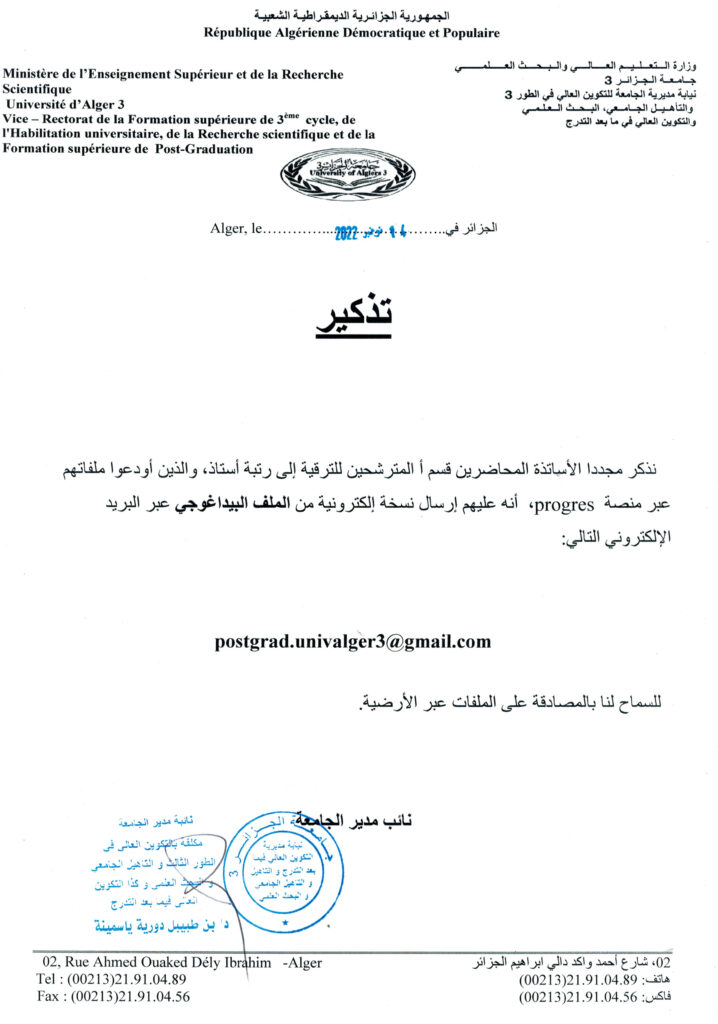 تذكير 14 نوفمبر، 2022 أخبار الجامعة, مستجدات الجامعة, نيابة مديرية الجامعة لما بعد التدرج و البحث العلمي 1,337 زيارة شاركها tweet