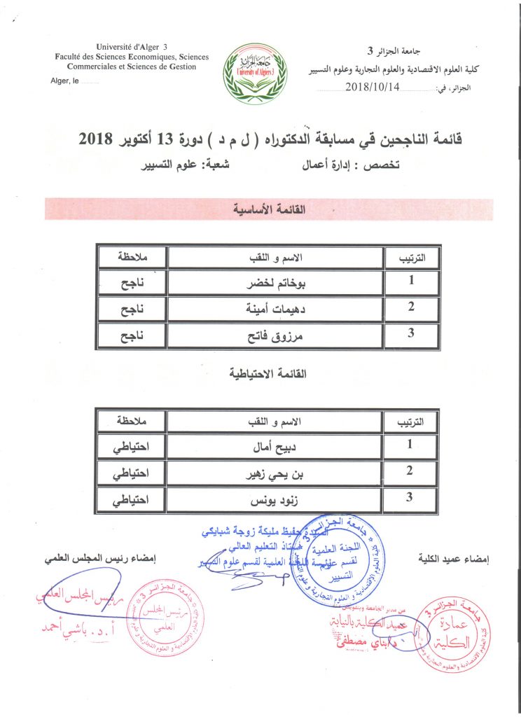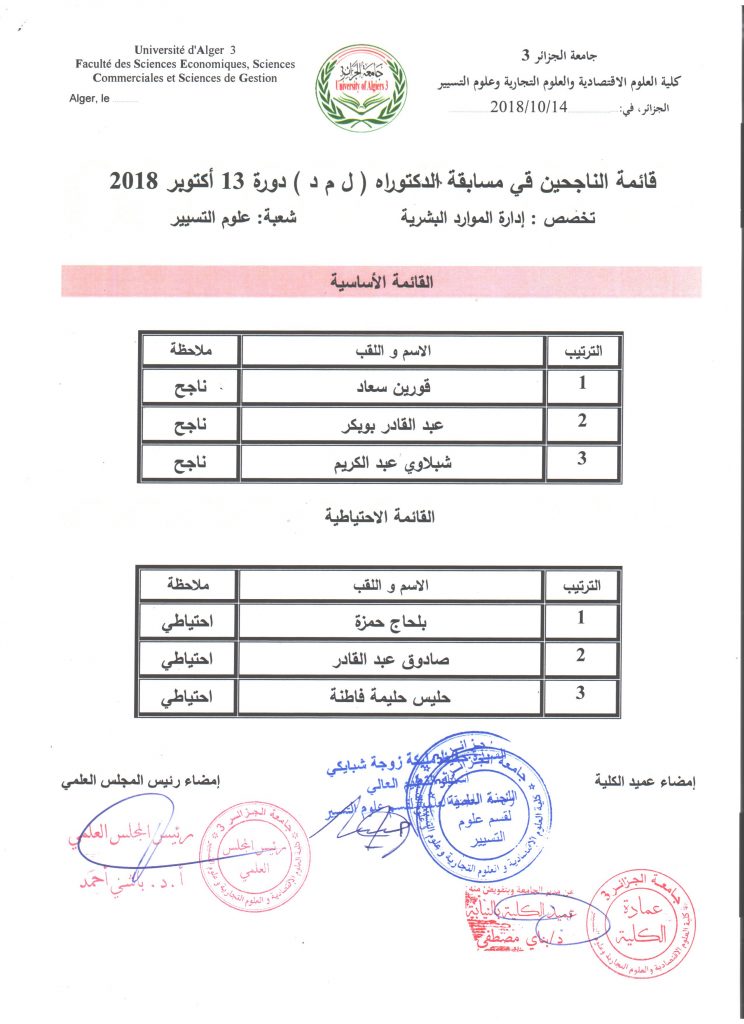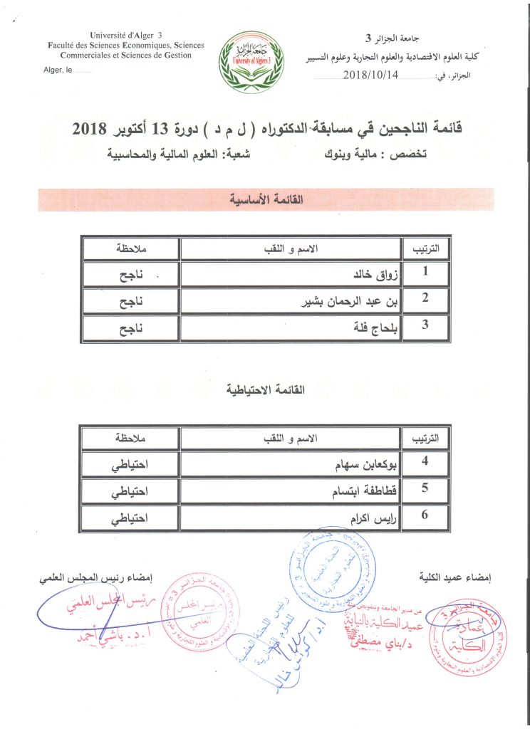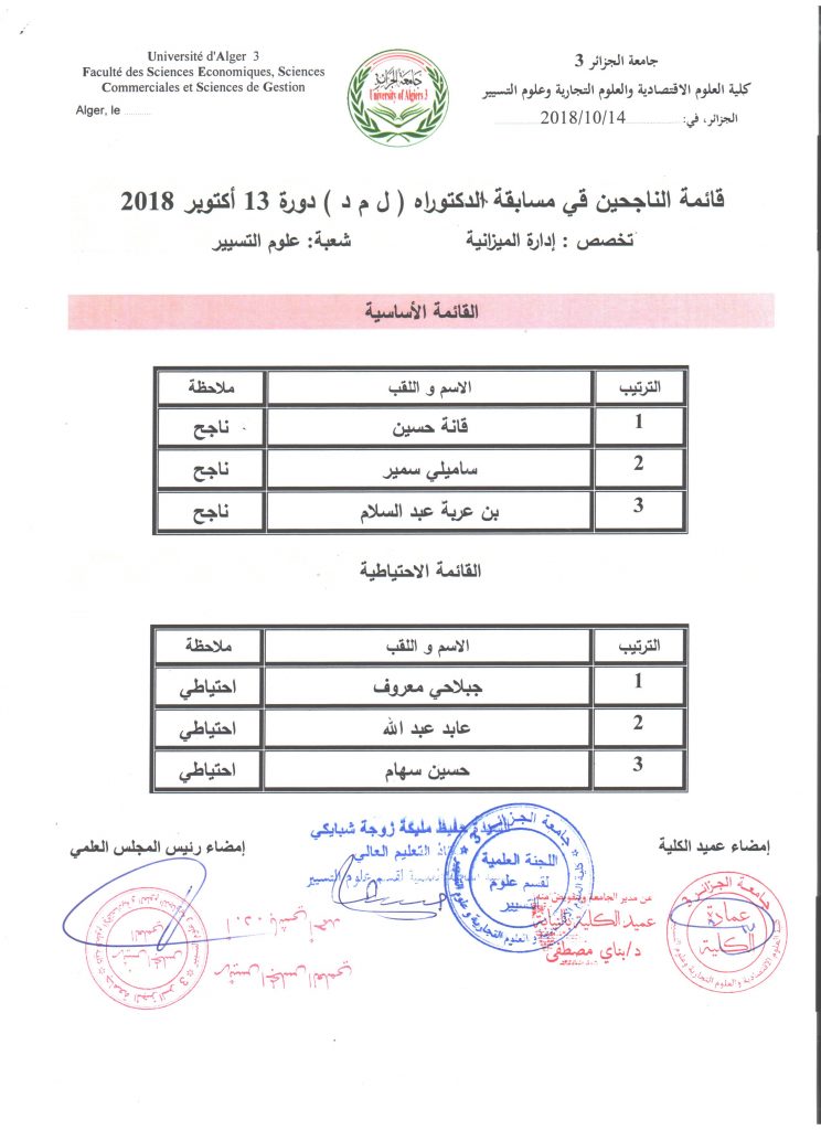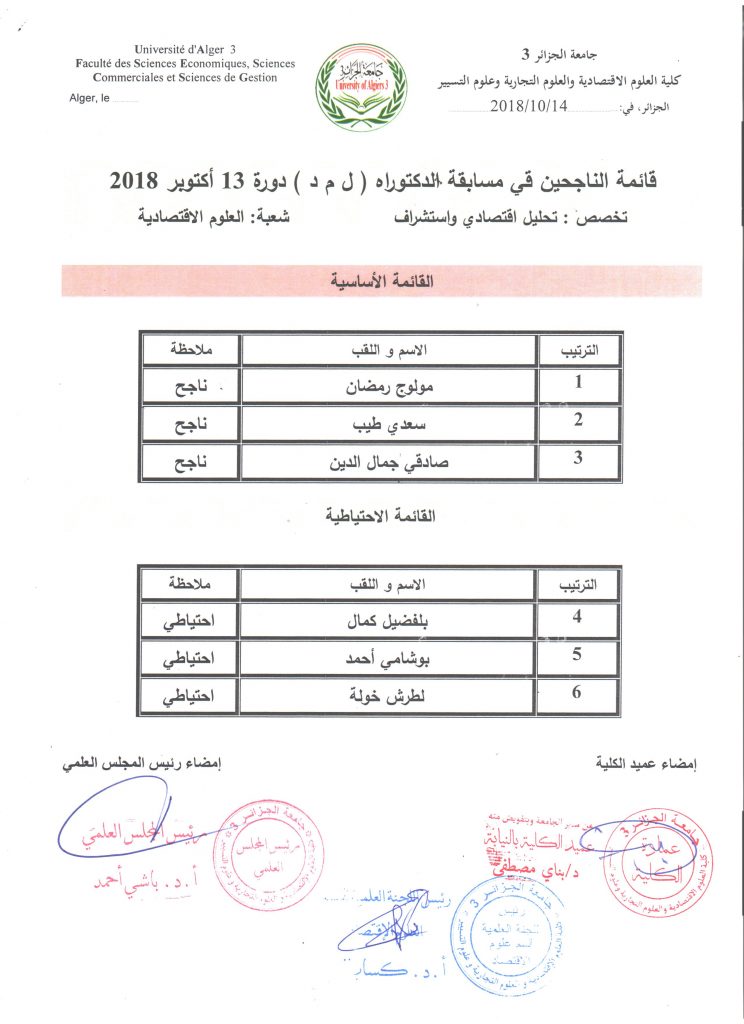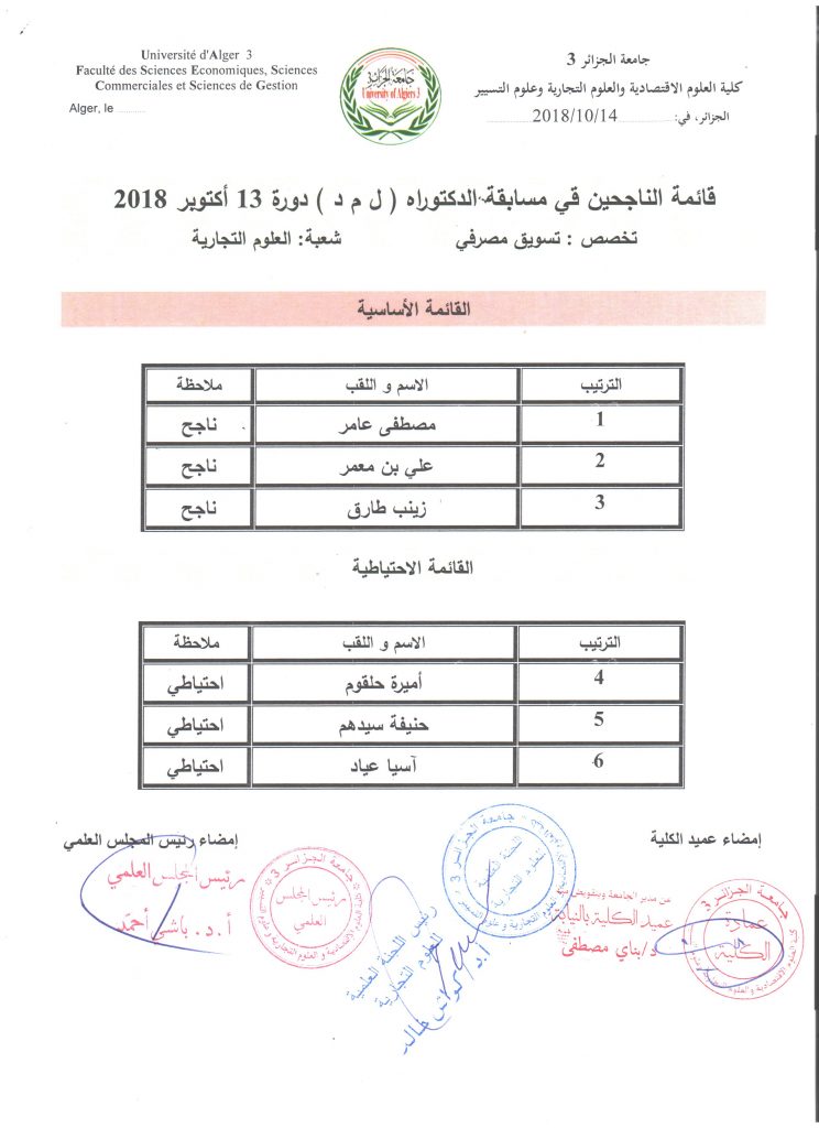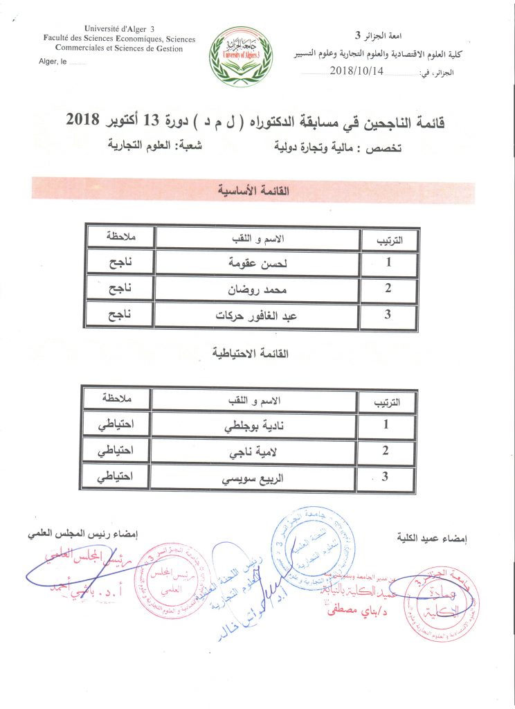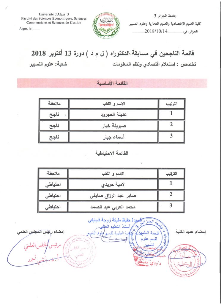 يشرفتا الإعلان عن قوائم الناجحين في مسابقة الالتحاق بالتكوين في الطور الثالث بعنوان السنة الجامعية 2018-2019 .
