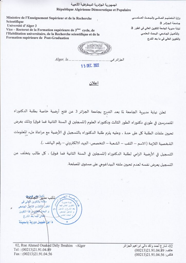 ملاحظة : هذه الارضية خاصة بطلبة الدكتوراه المتمدرسين بجامعة الجزائر 3 في طوري دكتوراه الطور الثالث ودكتوراه العلوم (المسجلين في السنة الثانية فما فوق). نعيد ونكرر الارضية خاصة بالطلبة المتمدرسين فقط (المسجلين في السنة الثانية فما فوق)، الامر لا علاقة له اطلاقا بالتسجيل في مسابقة الدكتوراه 2022-2023 والذي يتم حصريا على مستوى ارضية progres الخاصة بوزارة التعليم العالي والبحث العلمي.شكرا