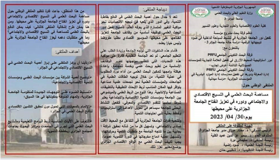 تاريخ انعقاد الملتقى يوم : 30 أفريل 2023، بكلية العلوم الاقتصادية، العلوم التجارية وعلوم التسيير بدالي ابراهيم.