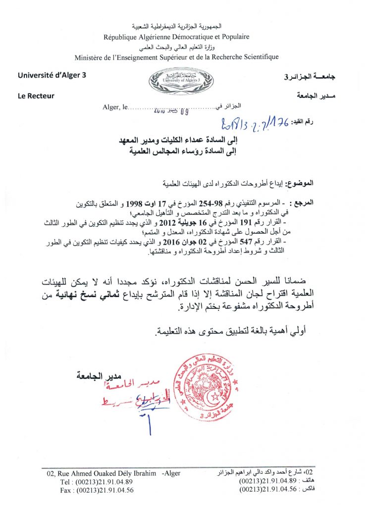 يشرفنا أن نضع تحت تصرفكم تعليمة خاصة بشروط إيداع أطروحات الدكتوراه لدى الهيئات العلمية من أجل اقتراح لجان المناقشة.
