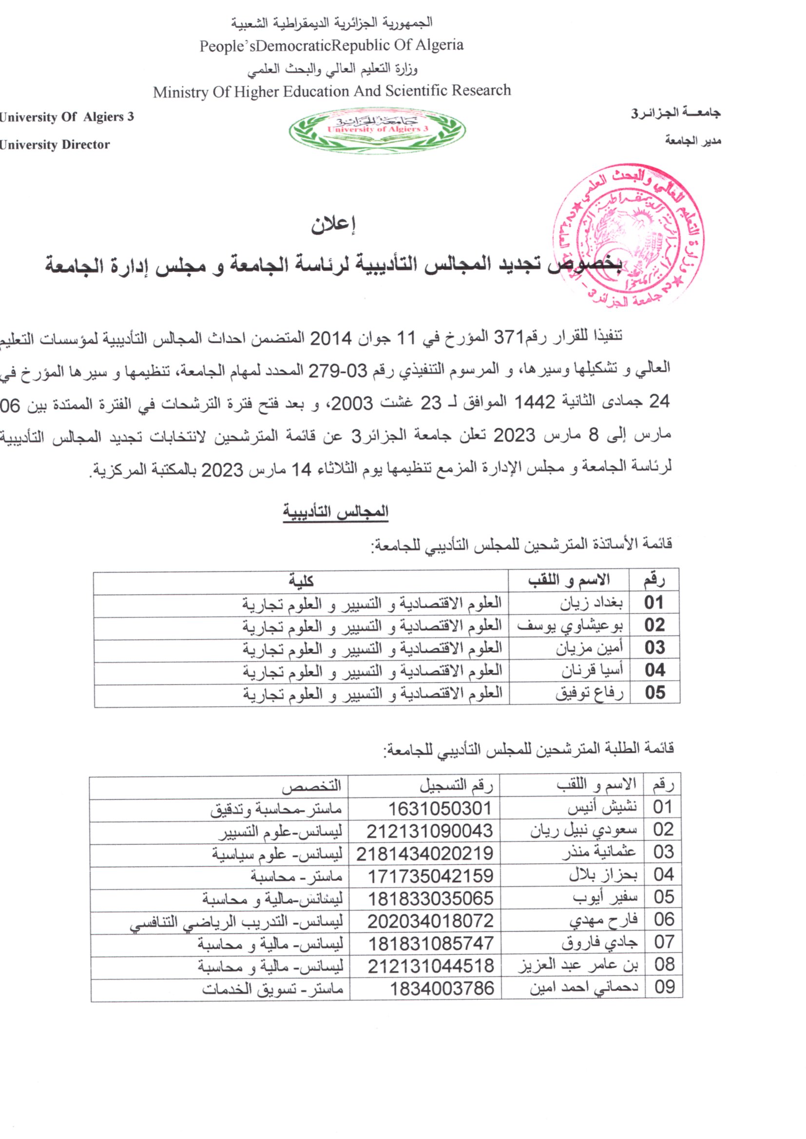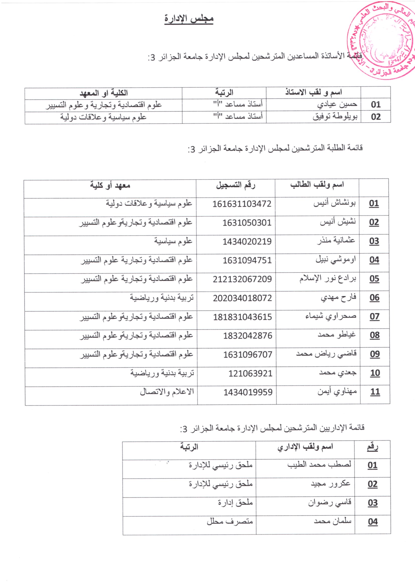 تجديد-المجالس-التأديبية-لرئاسة-الجامعة-و-مجلس-إدارة-الجامعةتنزيل قائمة-الأساتدة-المساعدين-،الطلبة-و-الإداريين-المترشحين-لمجلس-الأدارة-لجامعة-الجزائر-3تنزيل