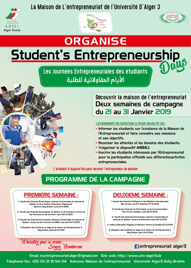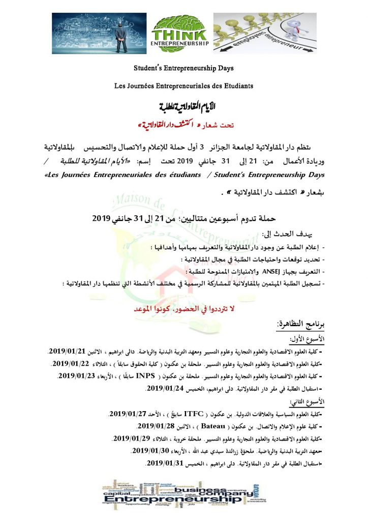 دار المقاولاتية لجامعة الجزائر 3 تدعو طلبة جامعة الجزائر3 بمختلف كلياتها ومعاهدها لحضور: