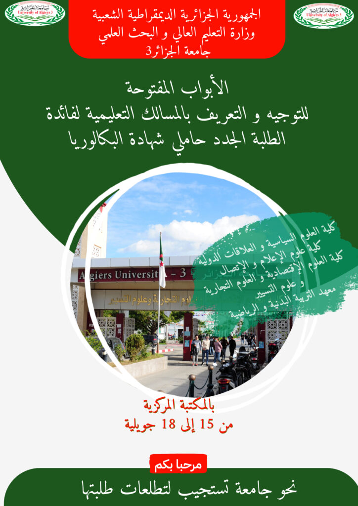 تدعو جامعة الجزائر 3 حاملي شهادة البكالوريا الجدد 2023 لحضور الأبواب المفتوحة التي تنظمها الجامعة بالمكتبة المركزية بدالي إبراهيم و الاطلاع عليها عبر الموقع الالكتروني للجامعة