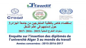 إستقصاء خاص بالطلبة المتخرجين من جامعة الجزائر3 حول إدماجهم في عالم الشغل سنوات التخرج 2015-2016-2017 28 فبراير، 2019 دار المقاولاتية 3,402 زيارة شاركها tweet