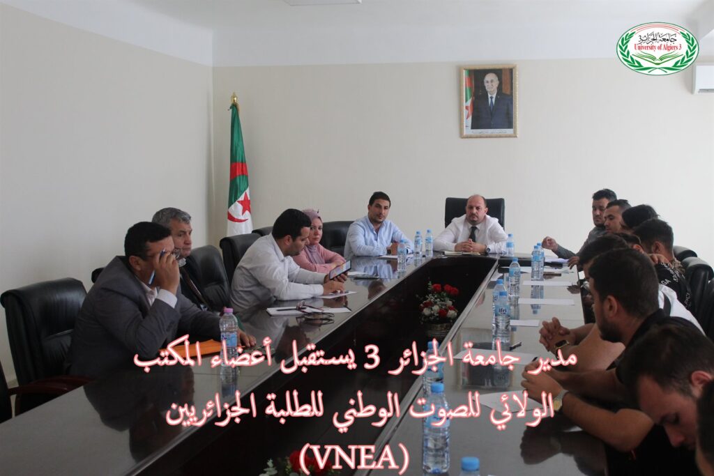مدير الجامعة وبعد تدخل نوابه وعمداء الكليات تناول تطرق بالتفصيل إلى كافة مطالب التنظيم بتقديم توضيحات وشروحات حول كل مطلب، ودعا طلبة التنظيم VNEA إلى التجند من أجل تحقيق طموحات جامعة الجزائر 3 ضمن الاستراتيجية الإصلاحية لوزارة التعليم العالي والبحث العلمي ذات مواصفات عالمية.