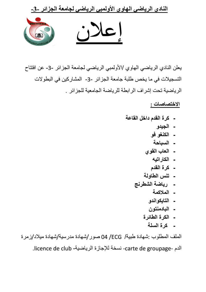 النادي الرياضي الهاوي / الألمبي الرياضي لجامعة الجزائر 3 – خاص بالطلبــة – 31 أكتوبر، 2023 أخبار الجامعة, النادي الرياضي الهاوي / الألمبي الرياضي لجامعة الجزائر 3 1,417 زيارة شاركها tweet