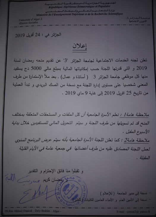 إعلان تجديد عضوية لجنة الخدمات الاجتماعية لجامعة الجزائر 3