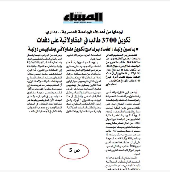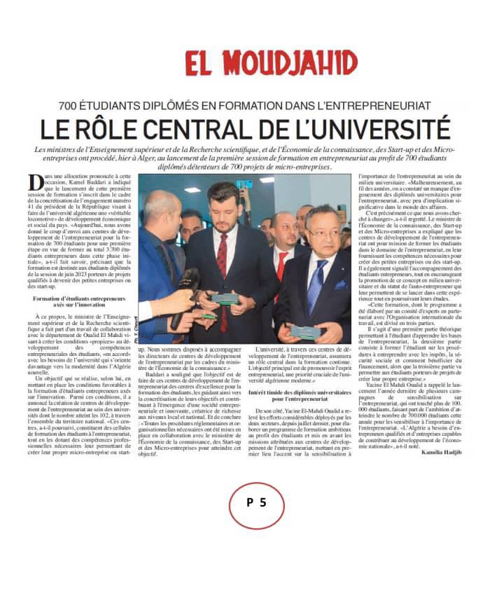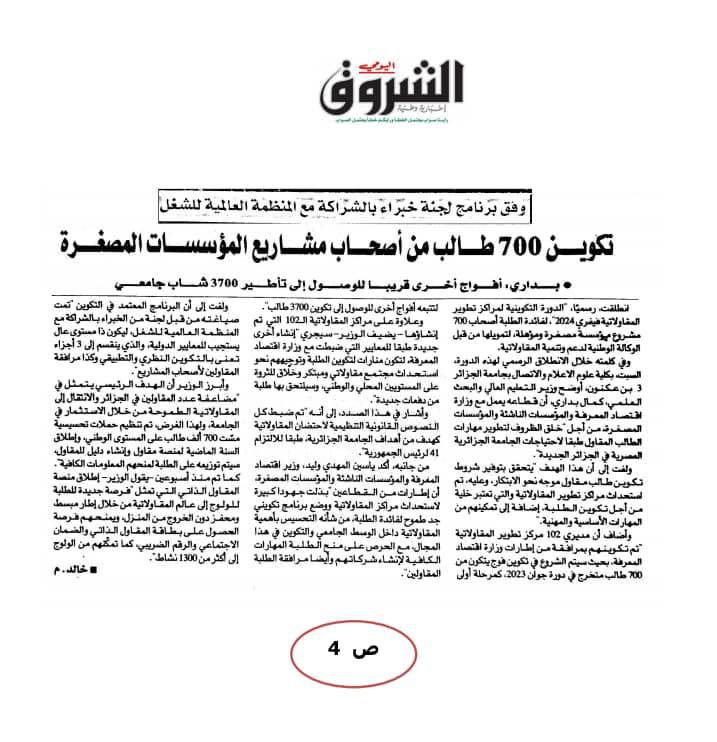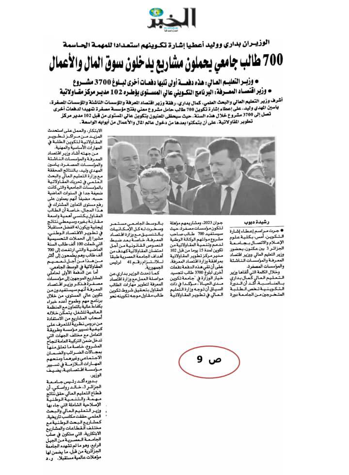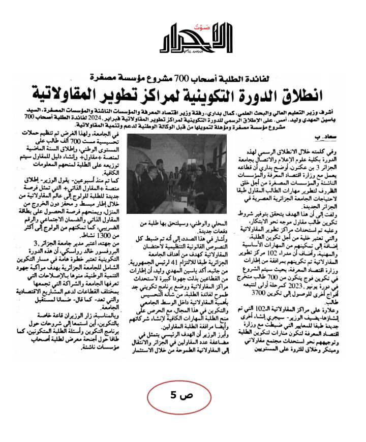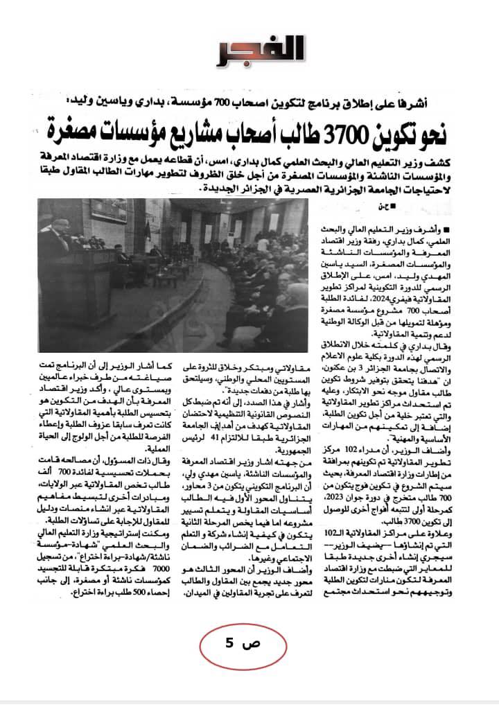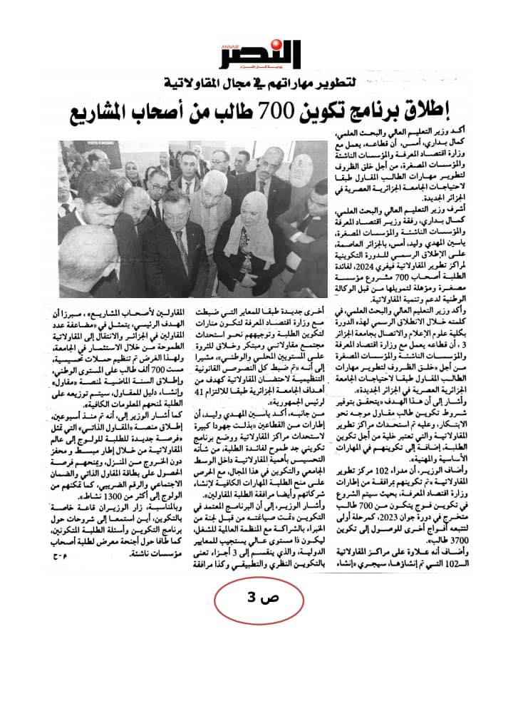 العرض الصحفي ليوم الأحد 11 فيفري 2024 الخاص بالإعلان الرسمي لانطلاق الدورة التكوينية لحاملي المشاريع الاقتصادية الموجهة لإنشاء مؤسسات مصغرة التي أشرف على افتتاحها السيدين وزير التعليم العالي والبحث العلمي ووزير اقتصاد المعرفة والمؤسسات الناشئة والمؤسسات المصغرة بجامعة الجزائر 3 السبت 10 فيفري 2024