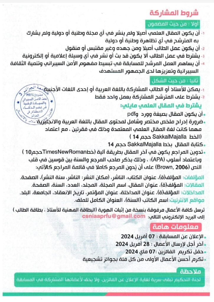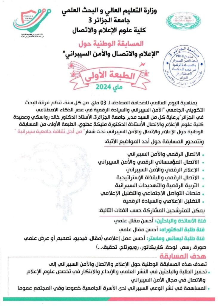 تتشرف فرقة “الأمن السيبراني والسيادة الرقمية في عصر الذكاء الاصطناعي في الجزائر” بدعوة الباحثين والطلبة للمشاركة في هذه المسابقة الوطنية بمناسبة اليوم العالمي للصحافة، تحت شعار “من أجل ثقافة جامعية سيبرانية”.