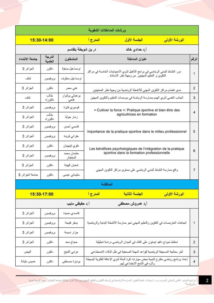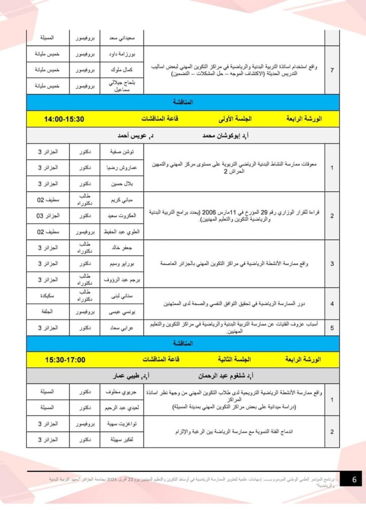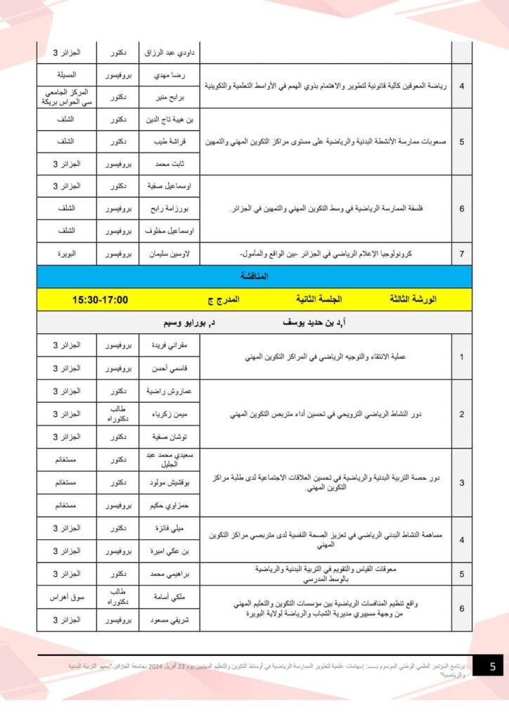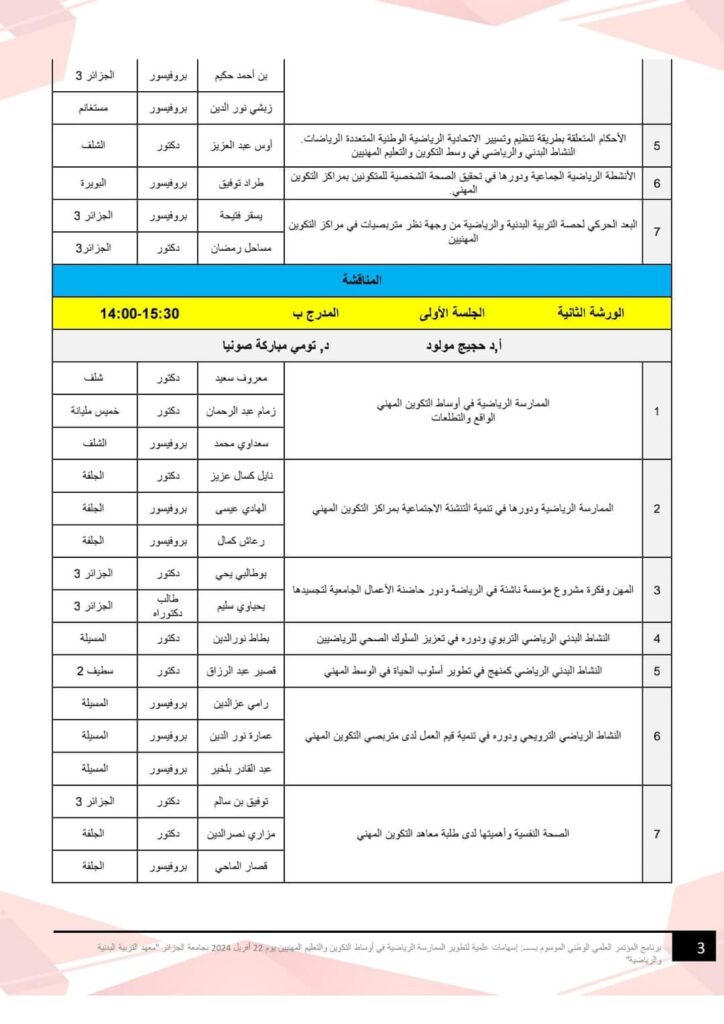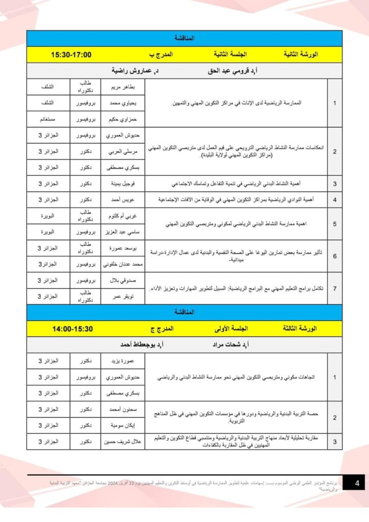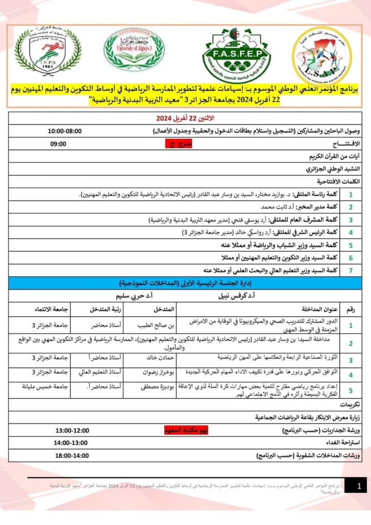 يوم الإثنين 22 أفريل 2024 بمعهد التربية البدنية والرياضية بجامعة الجزائر3. ● البرنامج النهائي