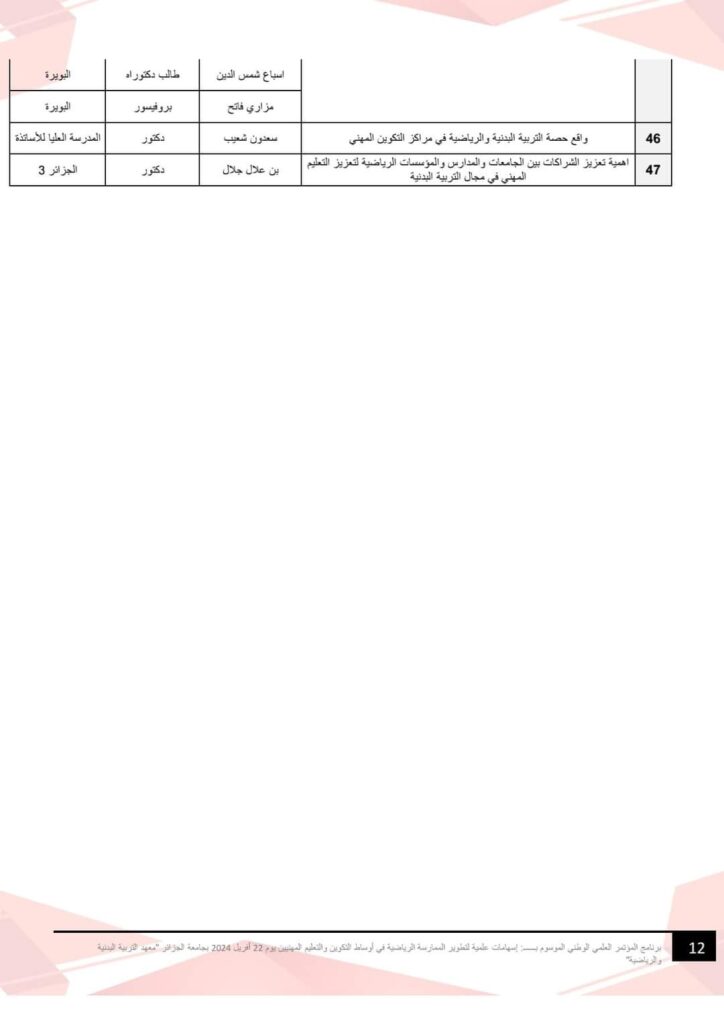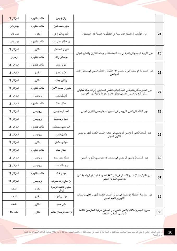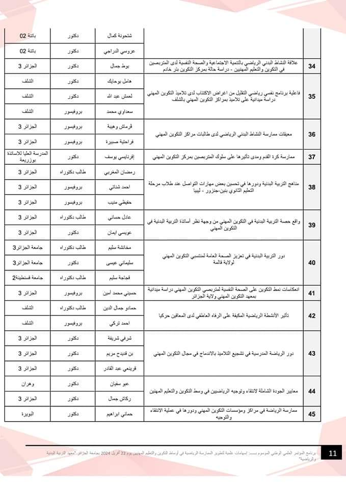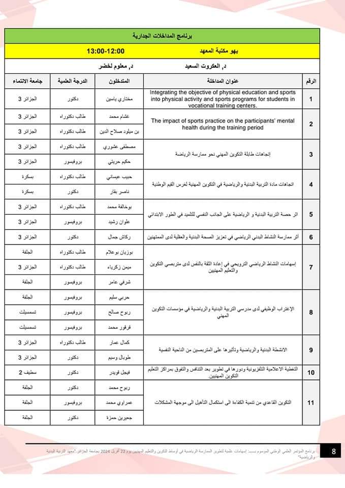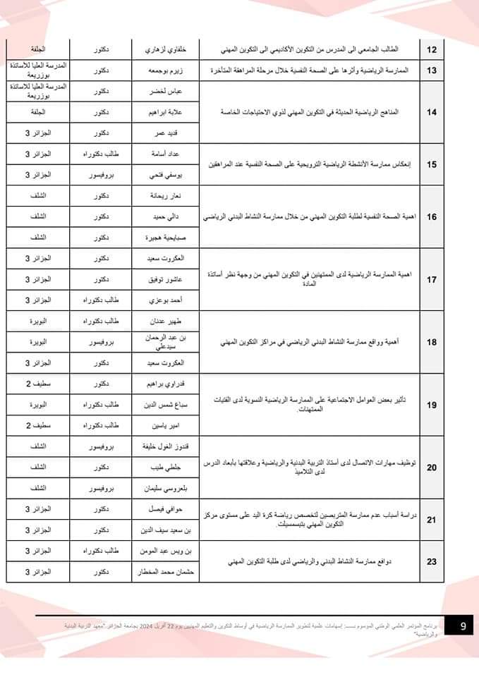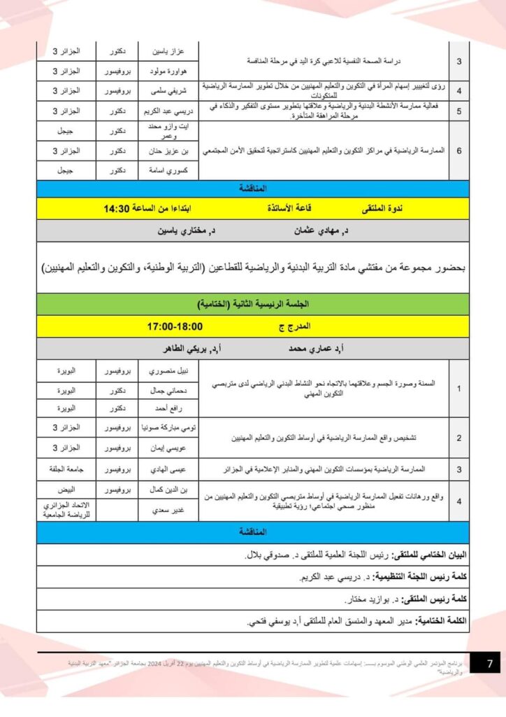يوم الإثنين 22 أفريل 2024 بمعهد التربية البدنية والرياضية بجامعة الجزائر3. ● البرنامج النهائي