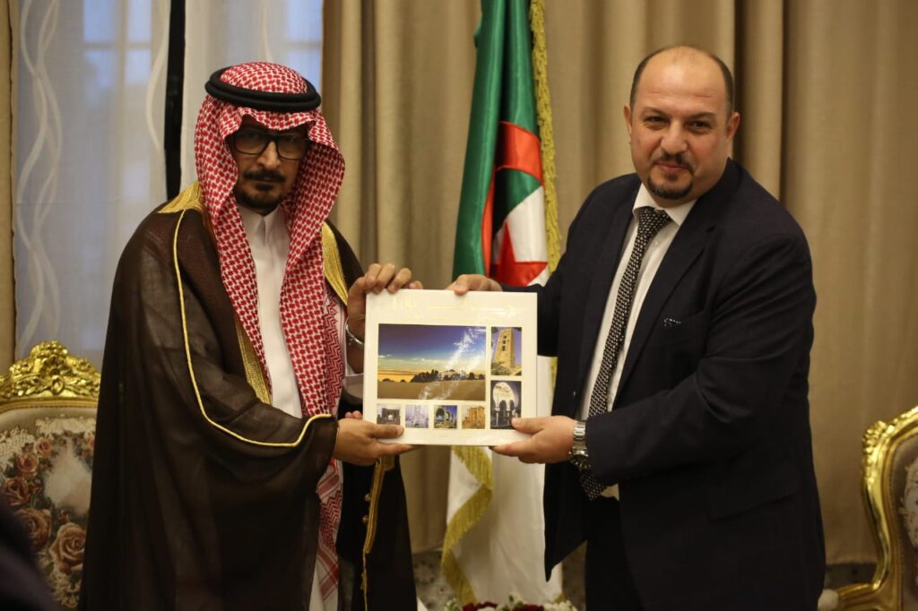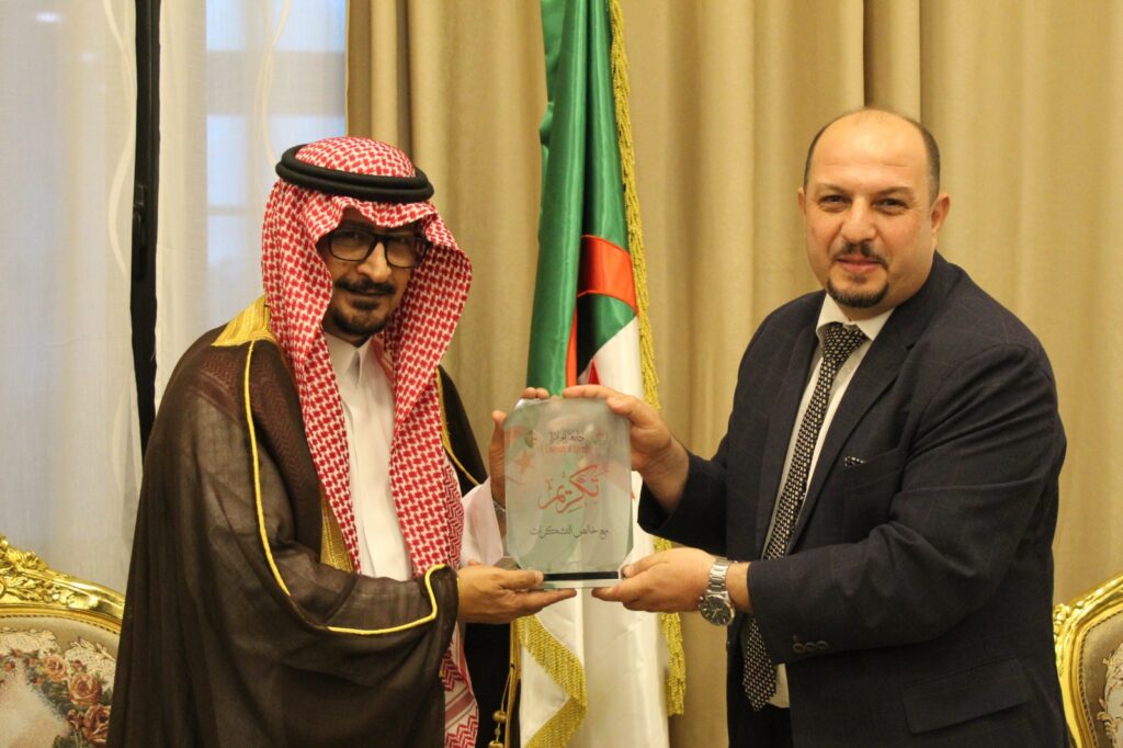 مدير الجامعة البروفيسور خالد رواسكي قدم في ختام الزيارة هدايا رمزية لسعادة سفير المملكة العربية السعودية لدى الجزائر بمناسبة زيارته للجامعة معبرا له عن بالغ التقدير و الإحترام لهذه الزيارة .