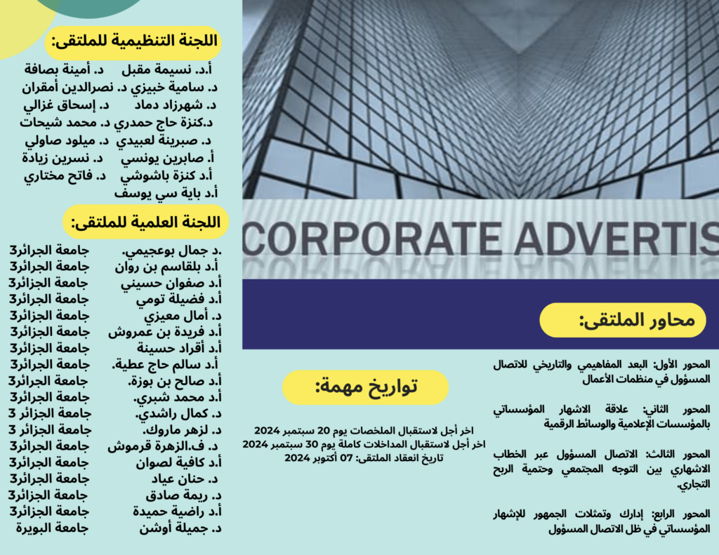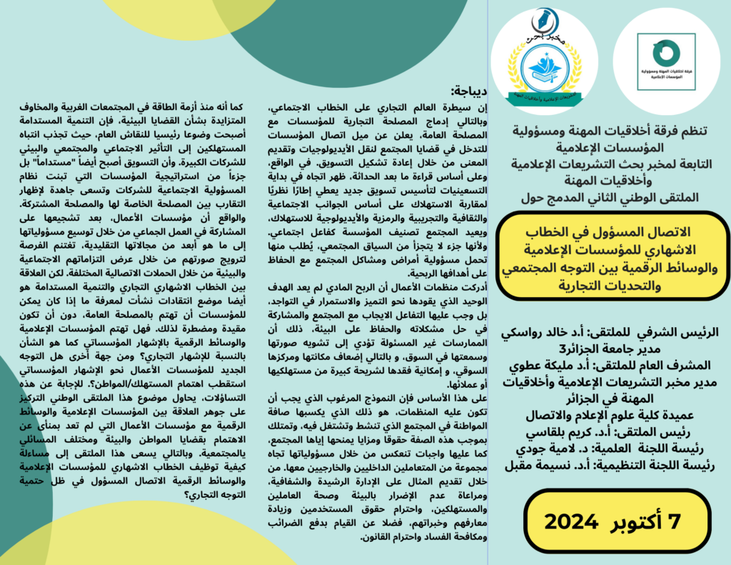 تاريخ انعقاد الملتقى يوم 07 أكتوبر 2024 بكلية علوم الاعلام والاتصال.