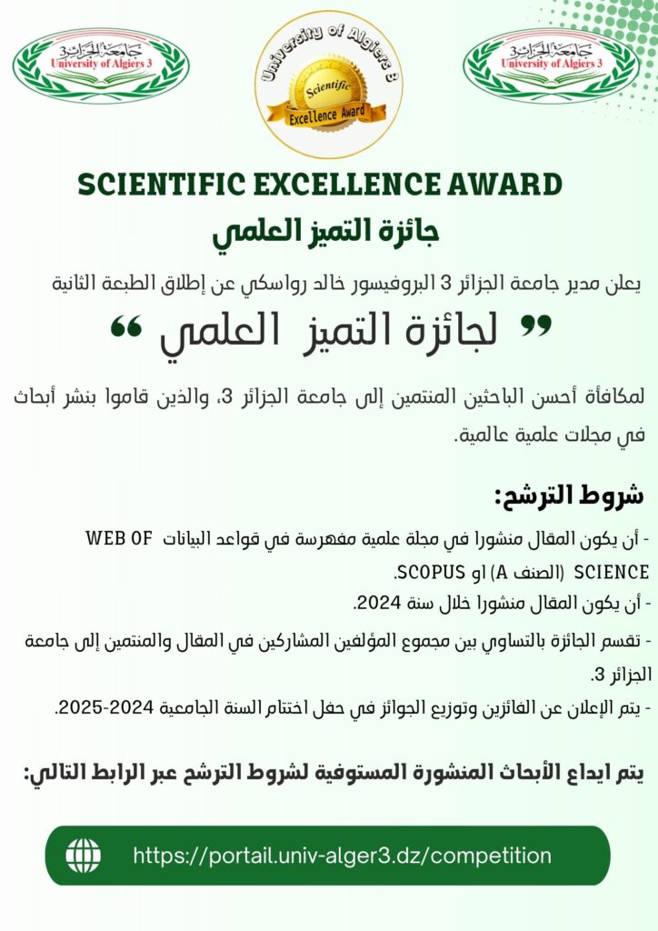 تعلن جامعة الجزائر 3 عن إطلاق الطبعة الثانية لجائزة التميز العلمي لمكافأة أحسن الباحثين المنتمين للجامعة والذين قاموا بنشر أبحاث في مجلات علمية مفهرسة في قواعد البيانات العالمية.