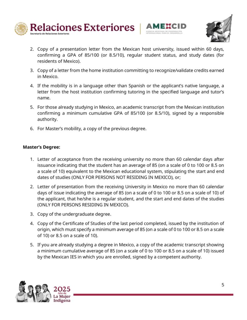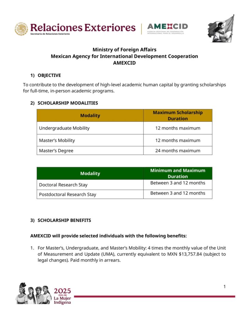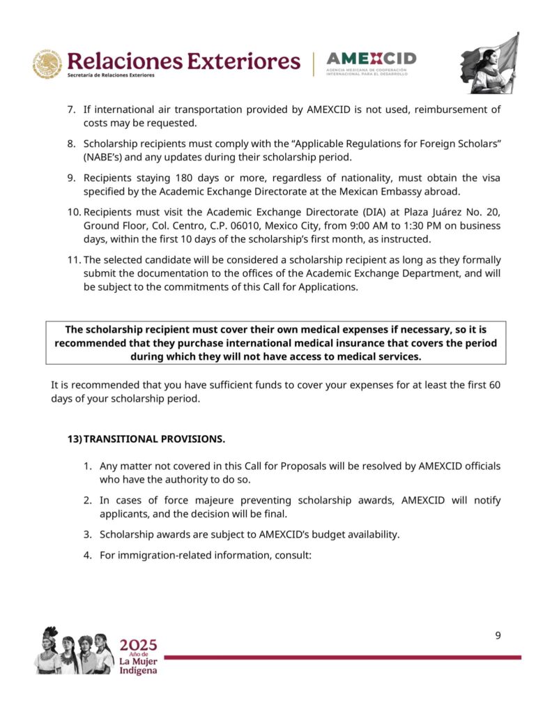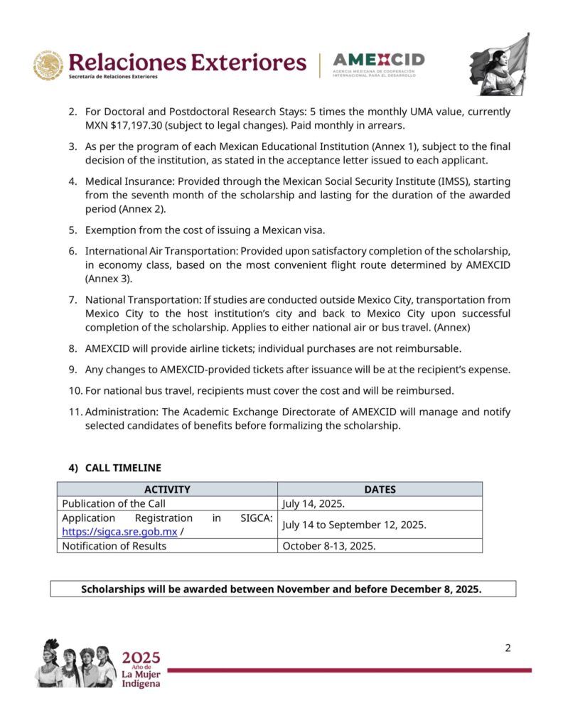 – إعفاء من رسوم التأشيرة- تغطية صحية- تذكرة سفر دولية عند إتمام المنحة بنجاح – نقل داخلي إلى المؤسسة المستضيفة في حال الدراسة خارج العاصمة مكسيكو