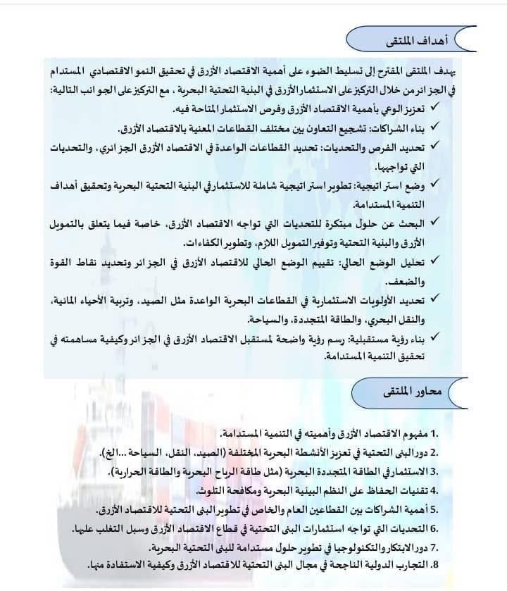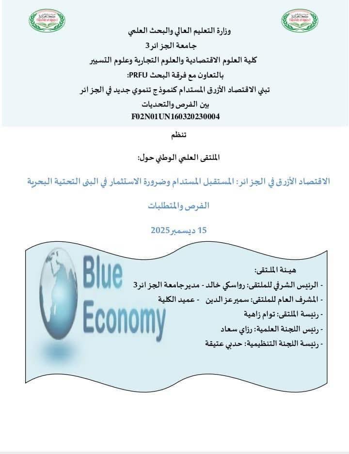 تعلن جامعة الجزائر3 عن تنظيم فرقة البحث PRFU، تبني الاقتصاد الازرق المستدام كنموذج تنموي جديد في الجزائر بين الفرص والتحديات، الملتقى العلمي الوطني حول: “الاقتصاد الأزرق في الجزائر :المستقبل المستدام وضرورة الاستثمار في البنى التحتية البحرية – فرص ومتطلبات ” وذلك يوم : 15 ديسمبر 2025.