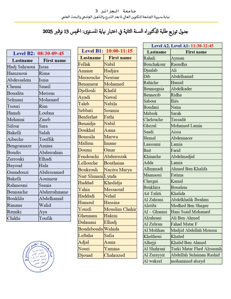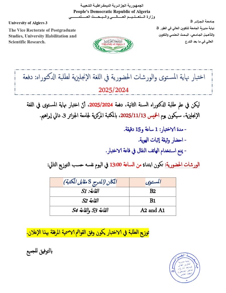 ليكن في علم طلبة الدكتوراه السنة الثانية، دفعة 2024/2025، أنّ اختبار نهاية المستوى في اللغة الإنجليزية، سيكون يوم الخميس 13/11/2025، بالمكتبة المركزية لجامعة الجزائر 3. دالي إبراهيم.