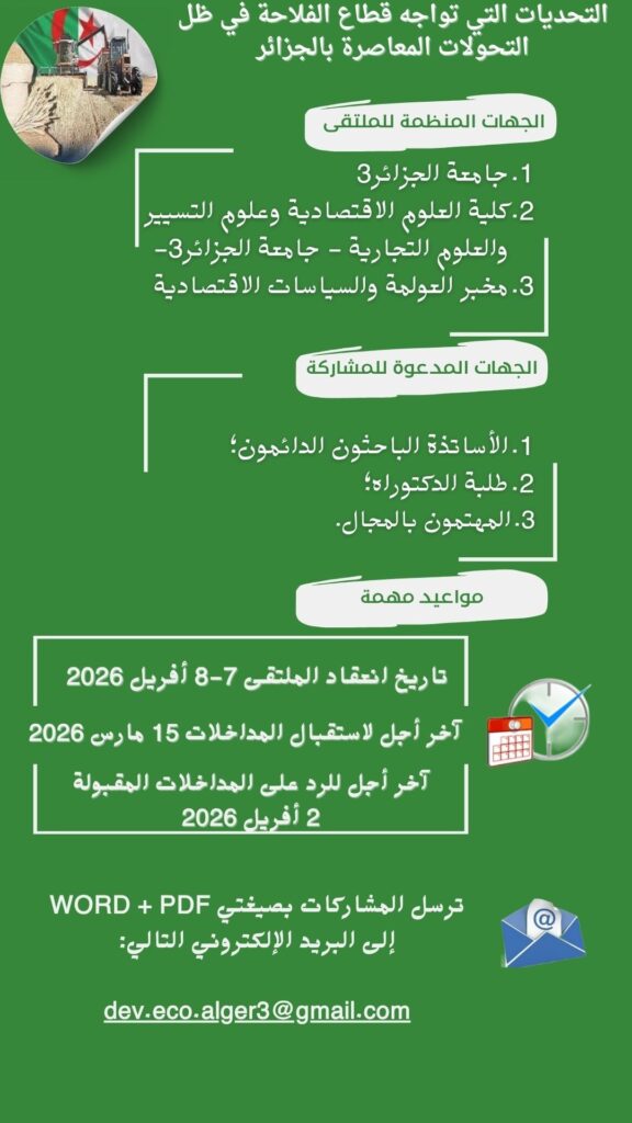 للتواصل: ترسل المشاركات عبر البريد الالكتروني التالي: dev.eco.alger3@gmail.com