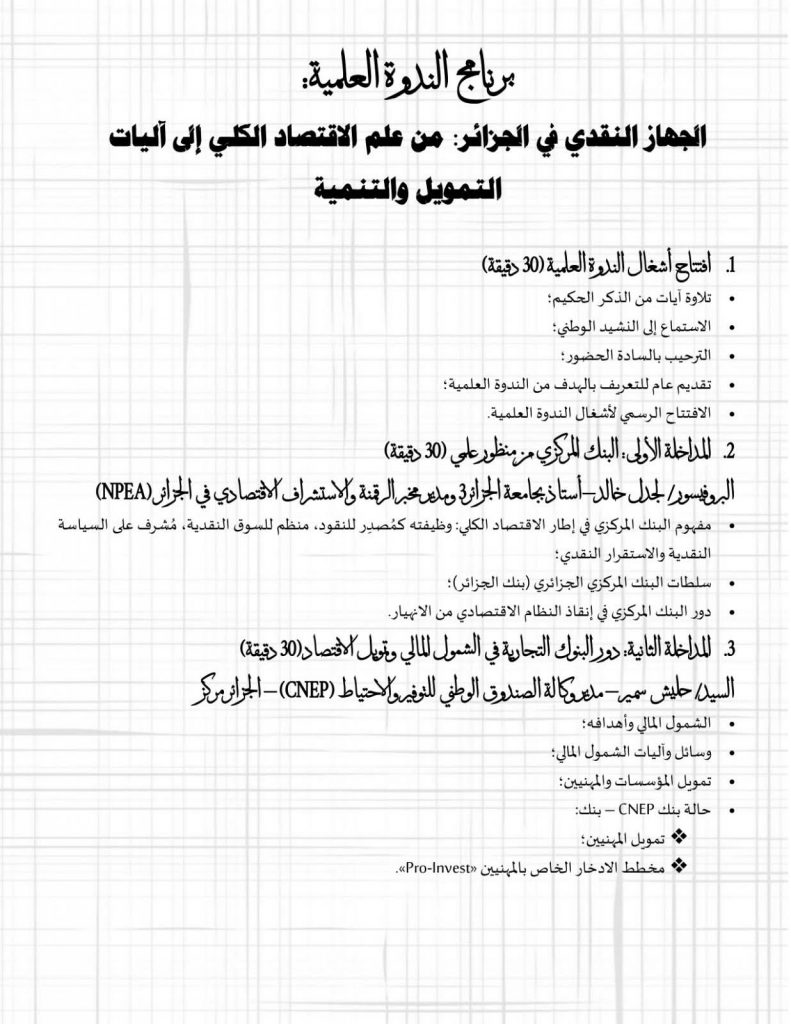 ندوة علمية حول: الجهاز النقدي في الجزائرمن علم الإقتصاد الكلي الى آليات التمويل والتنمية . 7 أبريل، 2026 أخبار الجامعة, كلية العلوم الاقتصادية العلوم التجارية و علوم التسيير, ندوات 460 زيارة تاريخ انعقاد الملتقى يوم 12 افريل 2026 بكلية العلوم الاقتصادية العلوم التجارية وعلوم التسيير. شاركها tweet