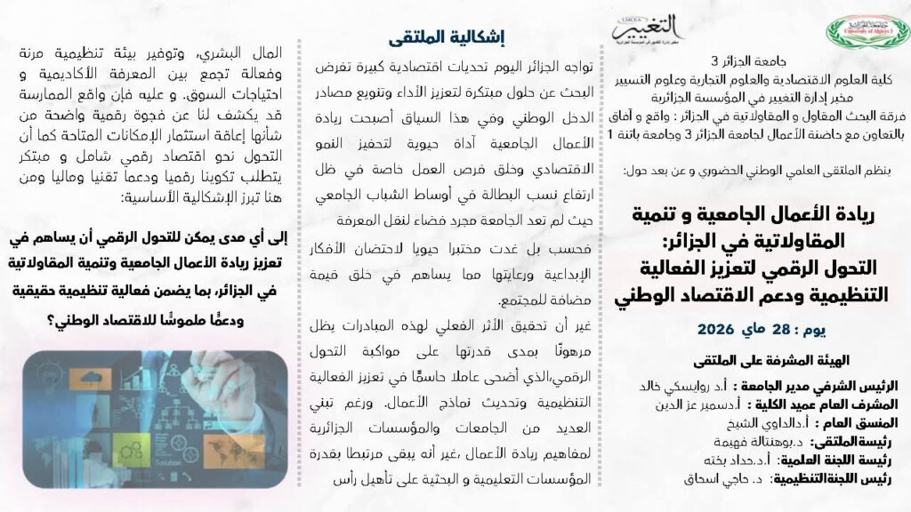 ملتقى وطني حول :ريادة الأعمال الجامعية وتنمية المقاولاتية في الجزائر :التحول الرقمي لتعزيز الفعالية التنظيمية ودعم الاقتصاد الوطني. 7 أبريل، 2026 أخبار الجامعة, كلية العلوم الاقتصادية العلوم التجارية و علوم التسيير, ملتقيات 411 زيارة تاريخ انعقاد الملتقى يوم 28 ماي 2026 بكلية العلوم الاقتصادية العلوم التجارية وعلوم التسيير. شاركها tweet