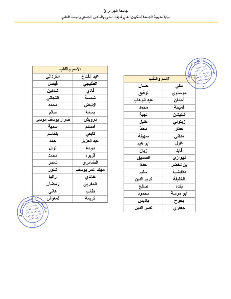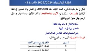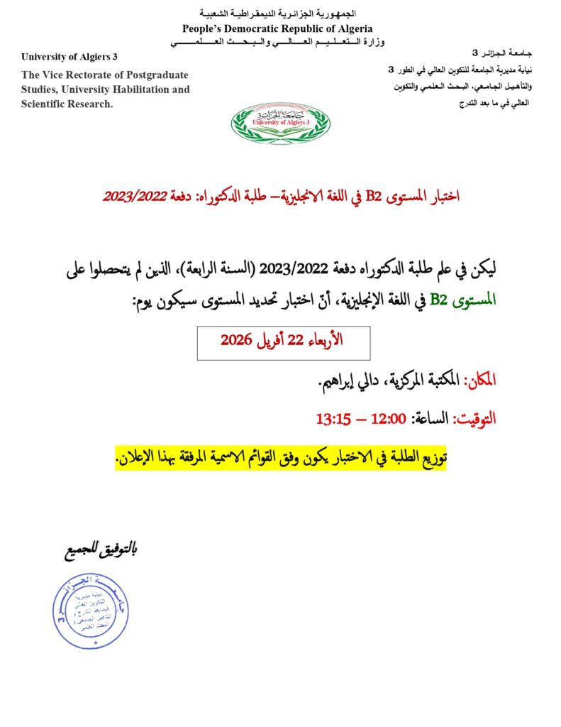 هام: ليكن في علم طلبة الدكتوراه دفعة 2022/2023، الذين لم يتحصلوا على مستوى B2 في اللغة الإنجليزية، أنه بامكانهم اعادة اجتياز امتحان المستوى B2 يوم الاربعاء 22 أفريل 2026، بالمكتبة المركزية، دالي إبراهيم.توزيع الطلبة في الاختبار يكون وفق القوائم الاسمية المرفقة بهذا الإعلان.بالتوفيق للجميع.
