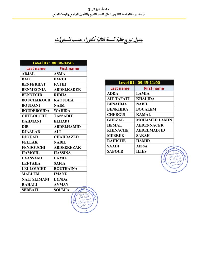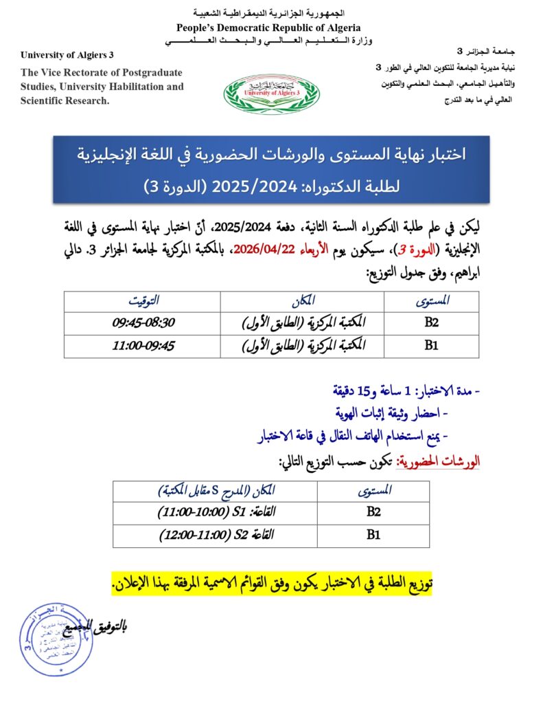 هام: ليكن في علم طلبة الدكتوراه السنة الثانية، دفعة 2024/2025، أنّ اختبار نهاية المستوى في اللغة الإنجليزية (الدورة الثالثة)، سيكون يوم الاربعاء 22/04/2026، بالمكتبة المركزية لجامعة الجزائر 3. دالي إبراهيم. توزيع الطلبة في الاختبار يكون وفق القوائم الاسمية المرفقة بهذا الإعلان.بالتوفيق للجميع.