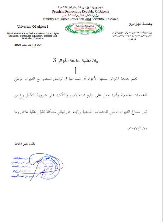 بيان لطلبة جامعة الجزائر 3
