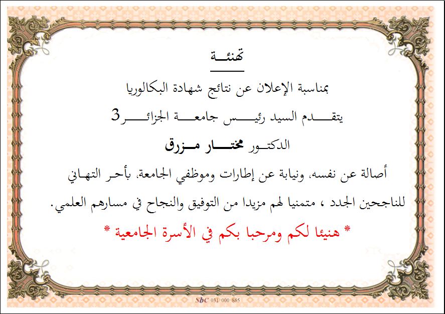 تهنئة مدير الجامعة للناجحين في شهادة البكالوريا 2020 15 أكتوبر، 2020 أخبار الجامعة 2,903 زيارة شاركها tweet