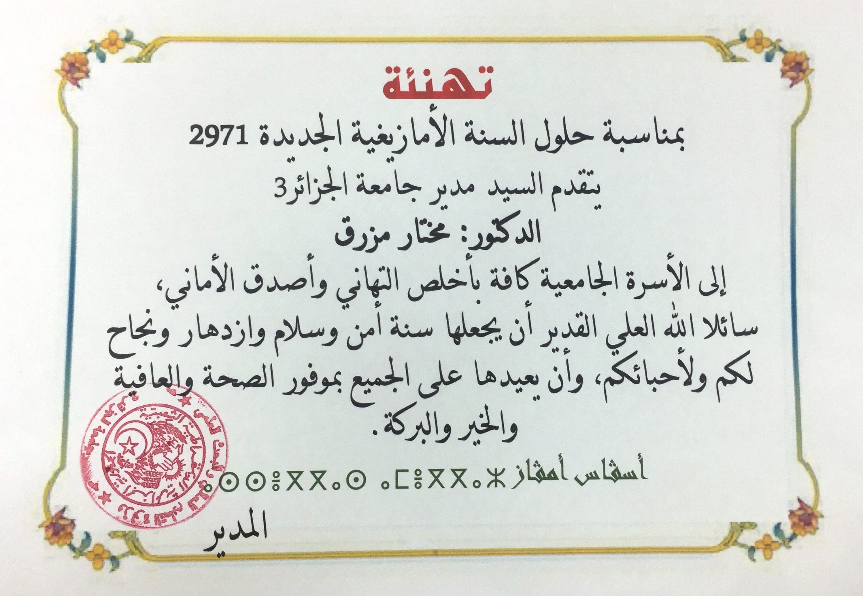 تهنئة بمناسبة حلول السنة الأمازيغية الجديدة 2971 11 يناير، 2021 أخبار الجامعة 7,977 زيارة شاركها tweet