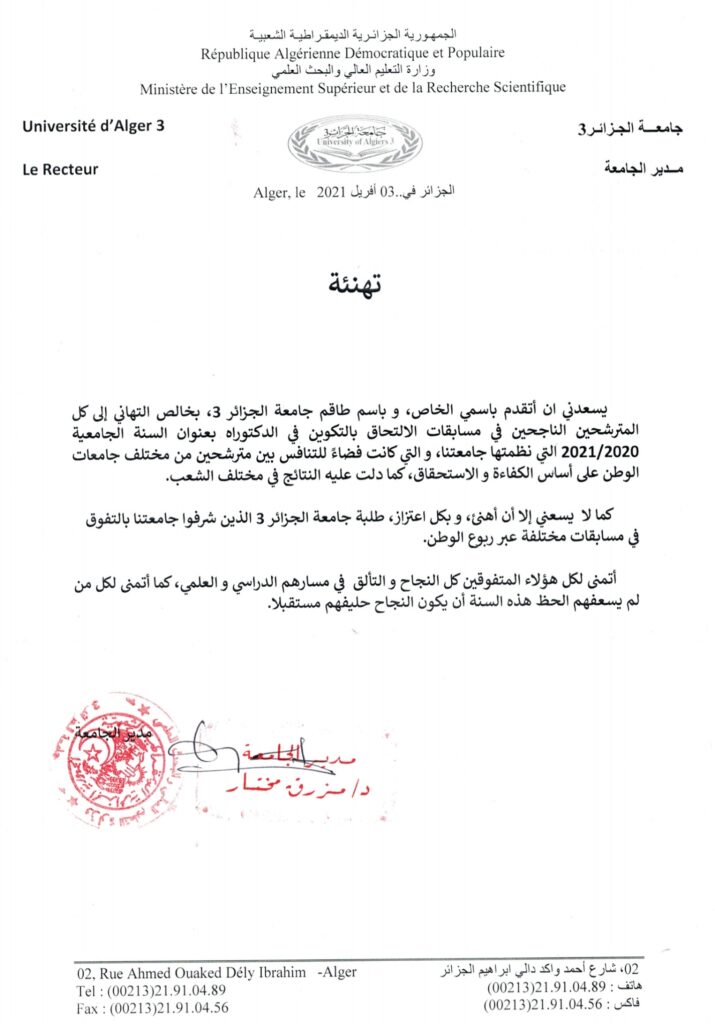 تهنئة السيد مدير الجامعة للناجحين في مسابقات الالتحاق بالتكوين في الدكتوراه بعنوان السنة الجامعية 2020-2021