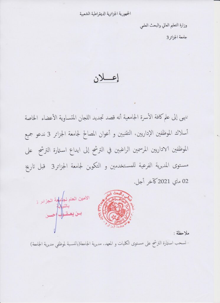 اعلان خاص بتجديد اللجان المتساوية الأعضاء الخاصة بأسلاك الموظفين الإداريين،التقنيين وأعوان المصالح 26 أبريل، 2021 أخبار الجامعة, مستجدات الجامعة 2,152 زيارة تحميل-استمارة-الترشح-تنزيل شاركها tweet