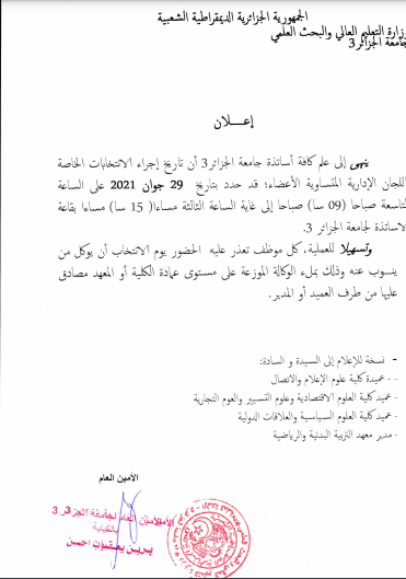 اعلان بخصوص الإنتخابات اللجان المتساوية الاعضاء الخاصة بالاساتذة 27 يونيو، 2021 أخبار الجامعة, مستجدات الجامعة 1,402 زيارة وكالةتنزيل شاركها tweet