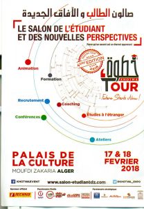 في إطار نشر ثقافة التكوين ودفع الشباب نحو مواصلة المشوار التعليمي والثقافي، تنظم وكالة WIN ADVENTS صالون الطالب والآفاق الجديدة “خطوة” بقصر الثقافة مفدي زكريا بالجزائر العاصمة، وهذا يومي 17 و18 فيفري 2018، حيث ستكون هذه التظاهرة الأولى من نوعها في الجزائر العاصمة.