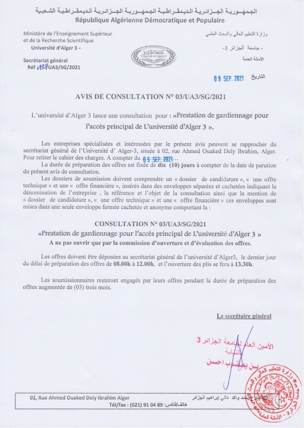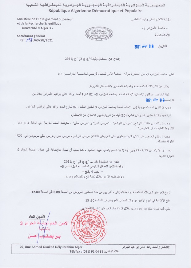 اعلان عن استشارة: حول خدمة الأمن للمدخل الرئيسي لجامعة الجزائر3 9 سبتمبر، 2021 أخبار الجامعة, استشارات 1,829 زيارة النسخة العربيـــة تحميل الملف النسخة الفرنسيـــة تحميل الملف شاركها tweet