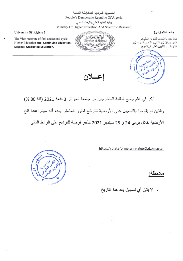 بخصوص إعادة فتح أرضية الماستر للمتأخرين حصة 80% 22 سبتمبر، 2021 أخبار الجامعة 2,607 زيارة شاركها tweet