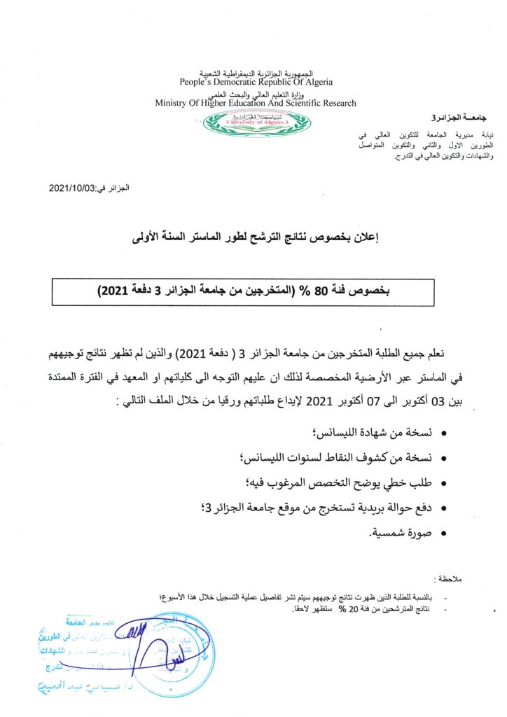 اعلان بخصوص نتائج الماستر 80%