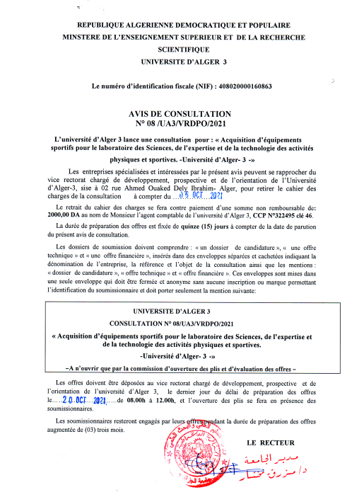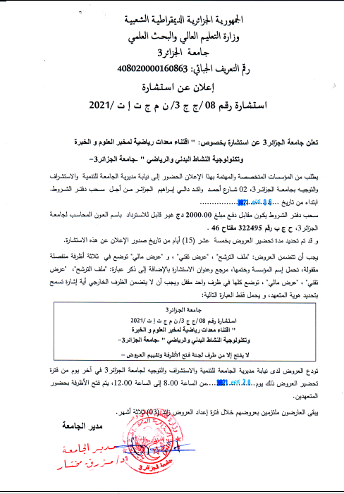 تعلن جامعة الجزائر 3 عن استشارة بخصوص اقتناء معدات رياضية لمخبر العلوم و الخبرة و تكنولوجية النشاط البدني و الرياضي