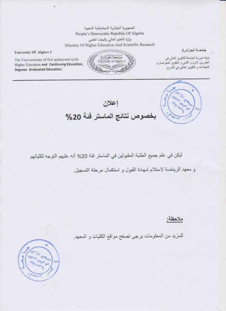 اعلان بخصوص نتائج الماستر فئة 20% 12 أكتوبر، 2021 أخبار الجامعة, مستجدات الجامعة 2,943 زيارة شاركها tweet