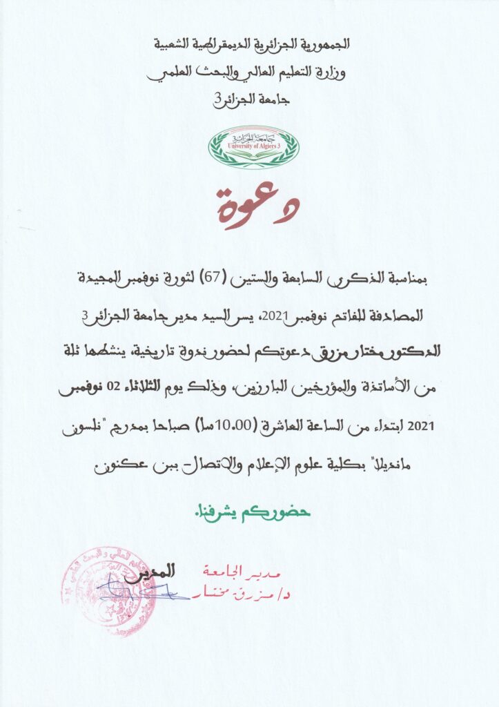 دعوة لحضور ندوة تاريخية بمناسبة الذكرى 67 لاندلاع الثورة التحريرية المجيدة 30 أكتوبر، 2021 أخبار الجامعة, ندوات 5,850 زيارة شاركها tweet