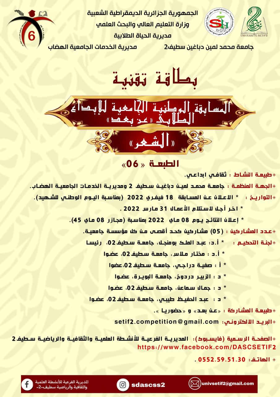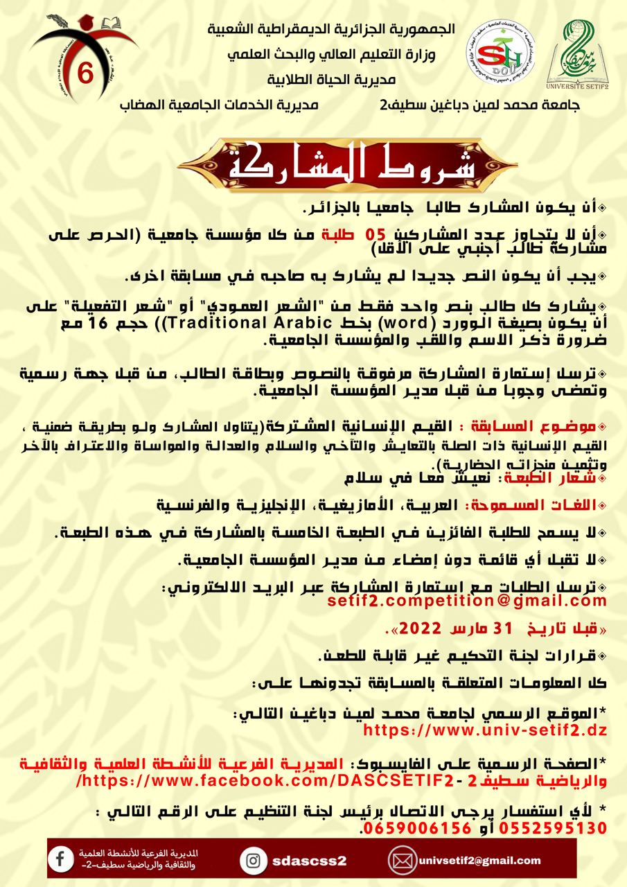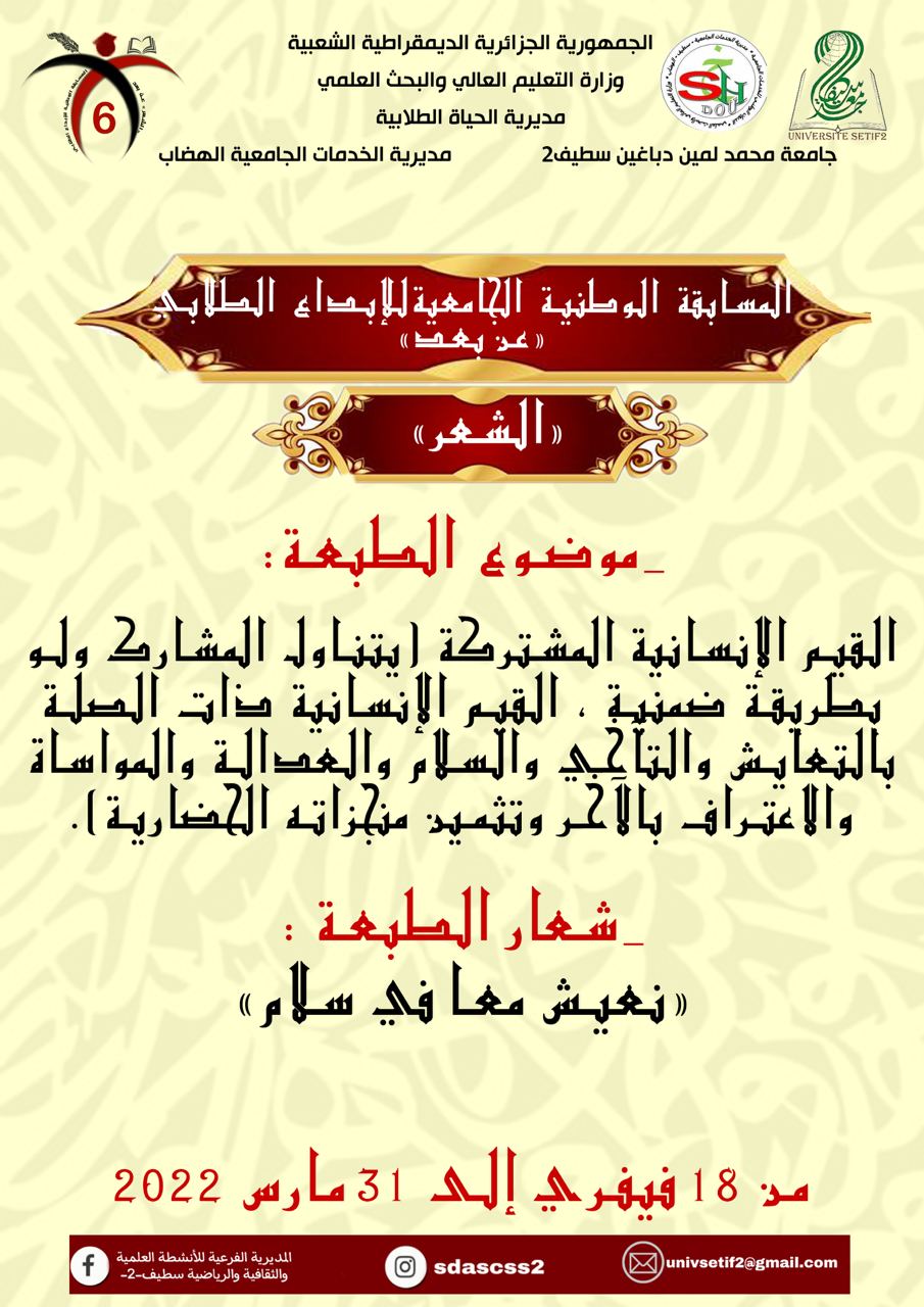 تنظم جامعة سطيف 02 الطبعة السادسة للمسابقة الوطنية للإبداع الطلابي “الشعر” في الفترة مابين 18 إلى 31 مارس 2022 تحت شعار “نعيش معا في سلام”.